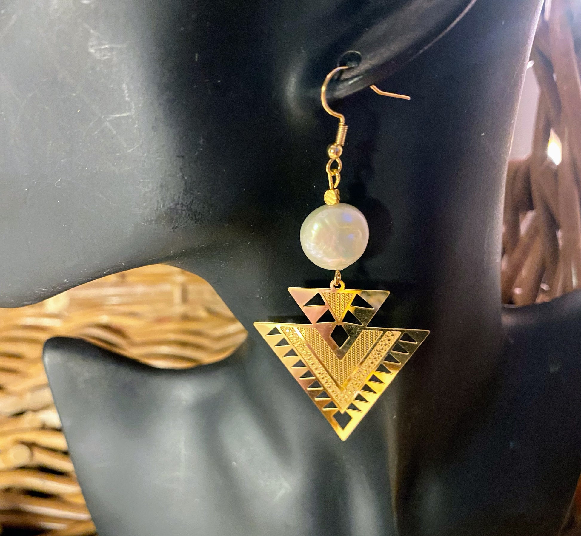 Experience the daring beauty of my Aztec and Keshi Pearl Earrings! Crafted with luxurious gold plating, these earrings exude confidence and elegance. Elevate any outfit with the unique blend of Aztec design and Keshi Pearls, representing courage and individuality. Dare to be bold and make a statement with these earrings!