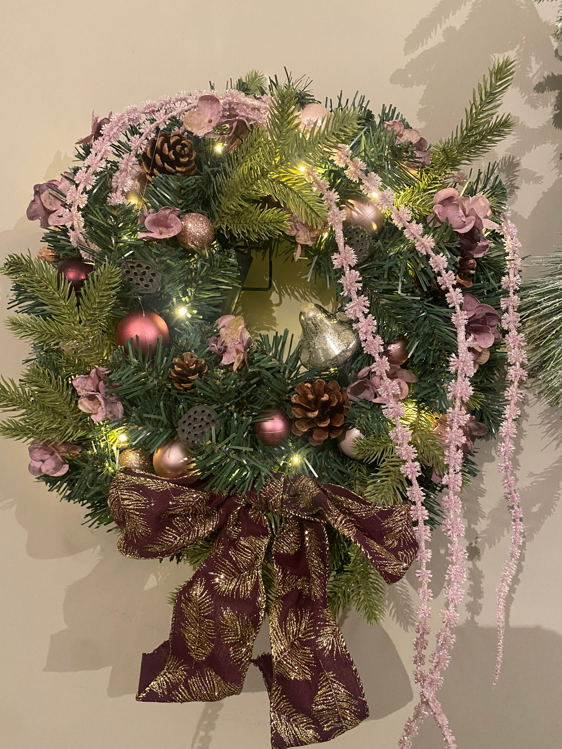 Get in the holiday spirit with this hand made Pink to make Santa Wink Door Wreath! This festive wreath features twinkling lights that will make your door stand out. Plus, with a playful nod to the classic phrase "tickled pink," this wreath is sure to bring a smile to your face (and Santa's!).